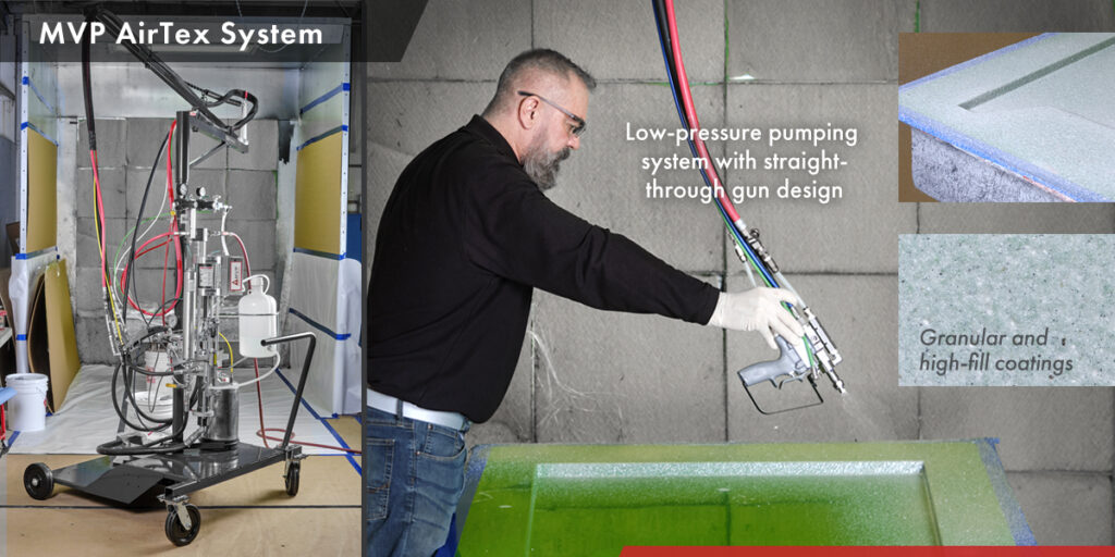 Engineered for precision and control, the AirTex Spray System is designed to handle sprayable granular coatings and highly filled materials with ease. Building on the proven performance of MVP legacy systems, AirTex combines a straight-through gun design and air-induction mixing to ensure smooth, consistent material flow – even with the most challenging materials.
