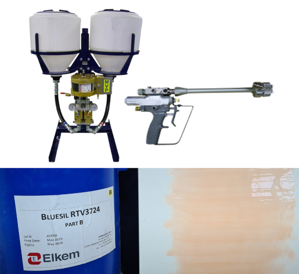 Leveraging MVP’s knowledge of the industry and manufacturing processes, Elkem recently launched BLUESILTM RTV 3724, a sprayable and brushable platinum-cure silicone to produce high-performance, reusable vacuum bags. BLUESILTM RTV 3724 has a 1:1 mix ratio by volume and is uniquely designed to be applied on a vertical surface without sagging. The two silicone components are expertly sprayed using MVP’s Patriot 1:1 Silicone System, which precisely blends and applies the silicone seamlessly.