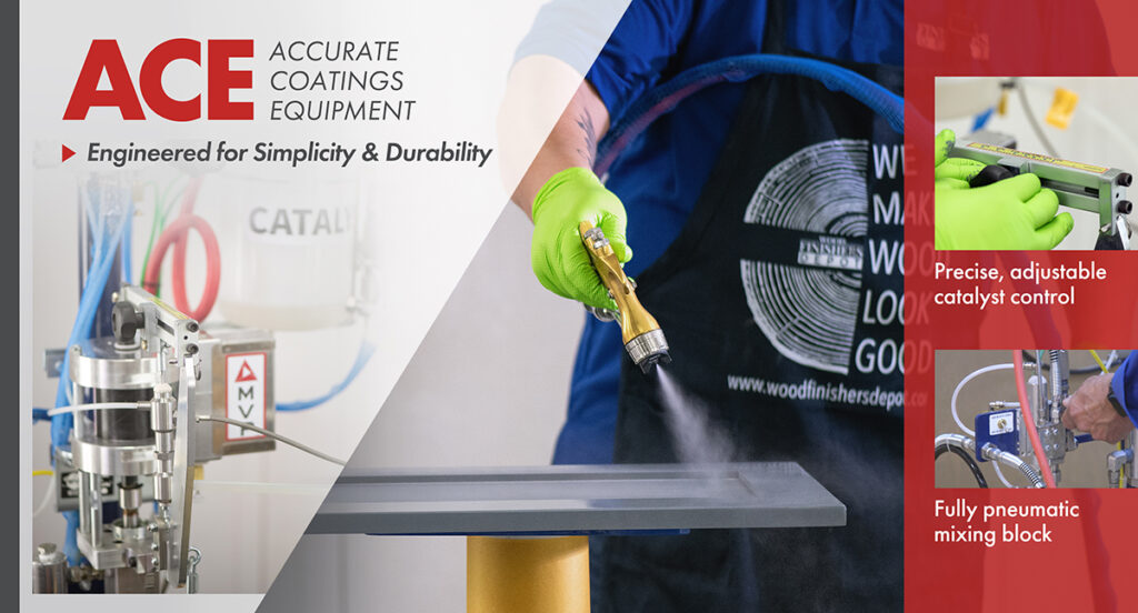 ACE (Accurate Coatings Equipment) is engineered for plural-component, high-performance spray applications, making it ideal for finishing cabinets, millwork, paneling, and furniture components. It’s a perfect fit for shops needing a durable, cost-effective solution to make their process more efficient. The 100% pneumatic design delivers precise, automated mixing and catalyst control, eliminating manual inconsistencies while saving time, labor, and material.